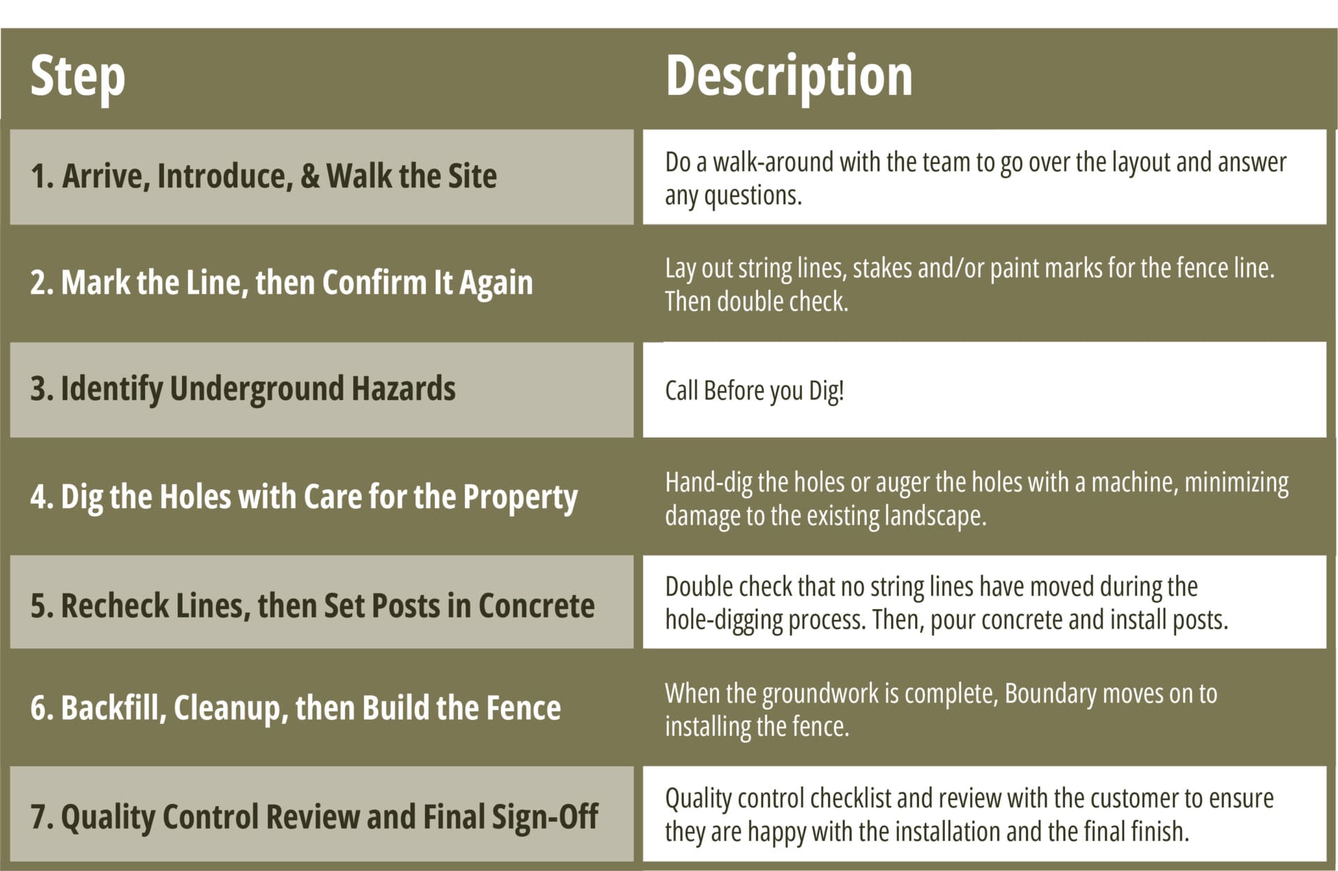 step by step chart outlining boundary fencing's install process
