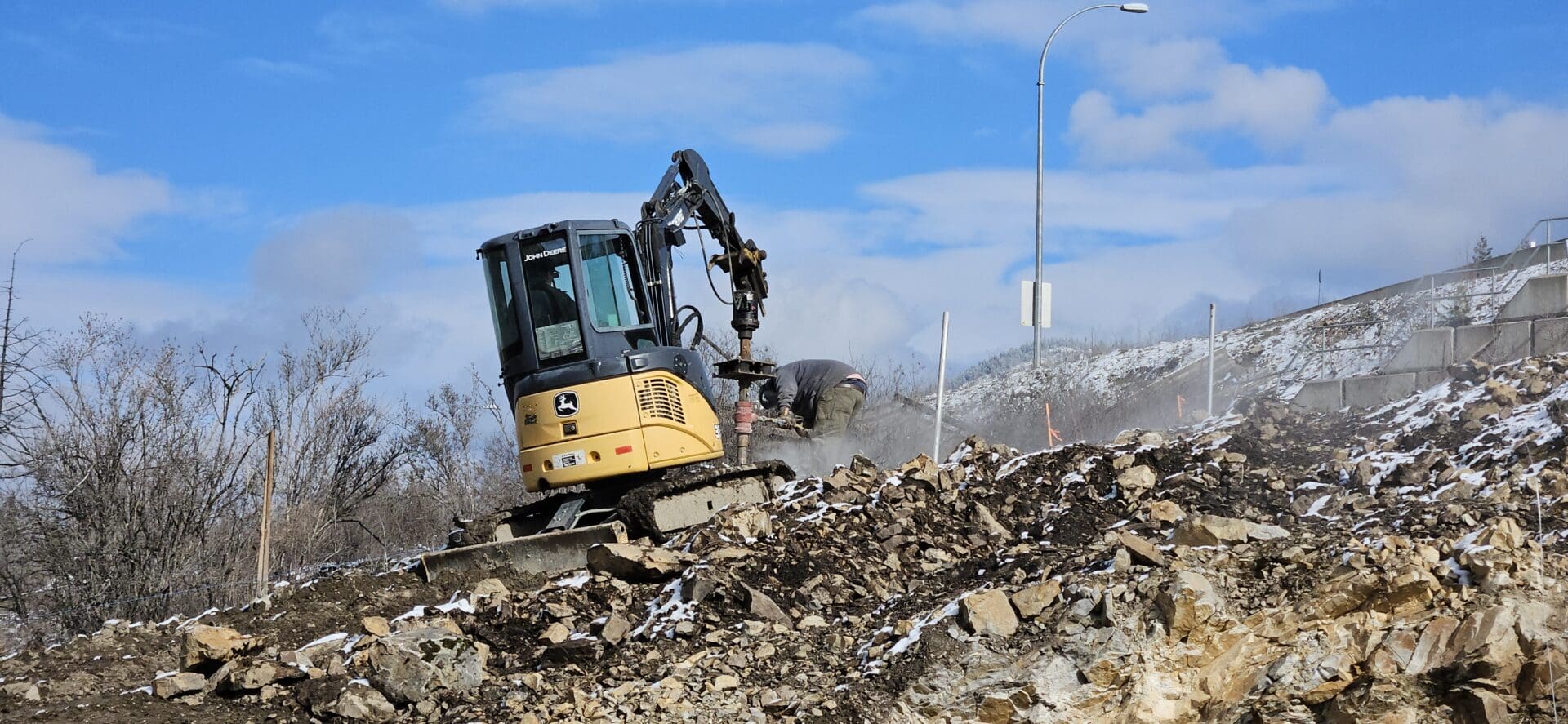 The Boundary Fencing team using specialized equipment to drill through bedrock for an infrastructure project in the Okanagan.